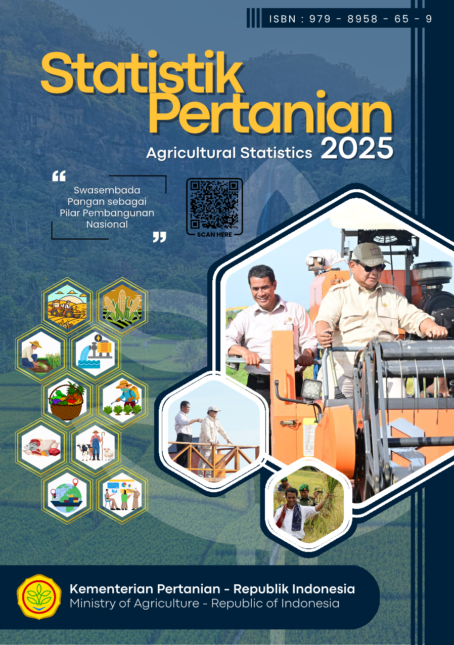 Buku Statistik Pertanian 2025 menyajikan data series untuk 5 (lima) tahun terakhir yang terbagi dalam 4 (empat) bab mulai dari data sub sistem agribisnis hulu sampai dengan data sub sistem agribisnis hilir. Data dan informasi sub sistem agribisnis hulu meliputi data sumber daya alam, sumber daya modal dan sarana produksi. Adapun data sub sistem usaha tani meliputi data produksi dan populasi. Data sub sistem agribisnis hilir meliputi data produk domestik bruto, nilai tukar petani, perdagangan komoditas pertanian, harga dan konsumsi pertanian. Data sub sistem jasa penunjang meliputi sumber daya manusia, hasil teknologi pertanian dan kelembagaan pertanian